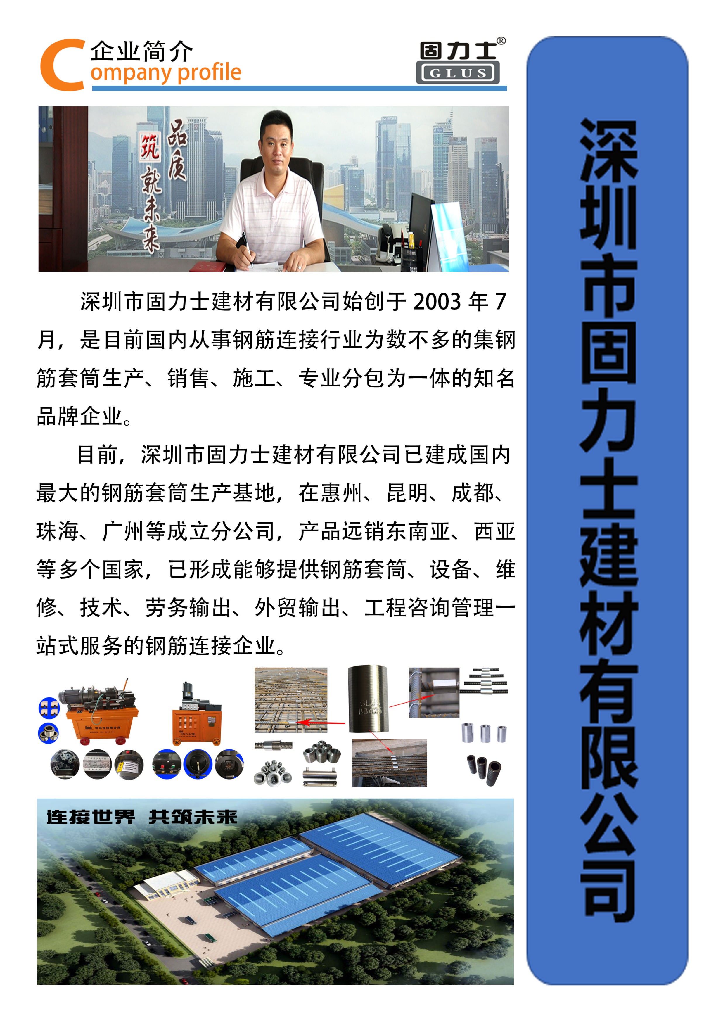 深圳市固力士建材有限公司始创于2003年7月,是目前国内从事钢筋连接行业为数不多的集钢!筋套筒生产、销售、施工、专业分包为一体的知名品牌企业。