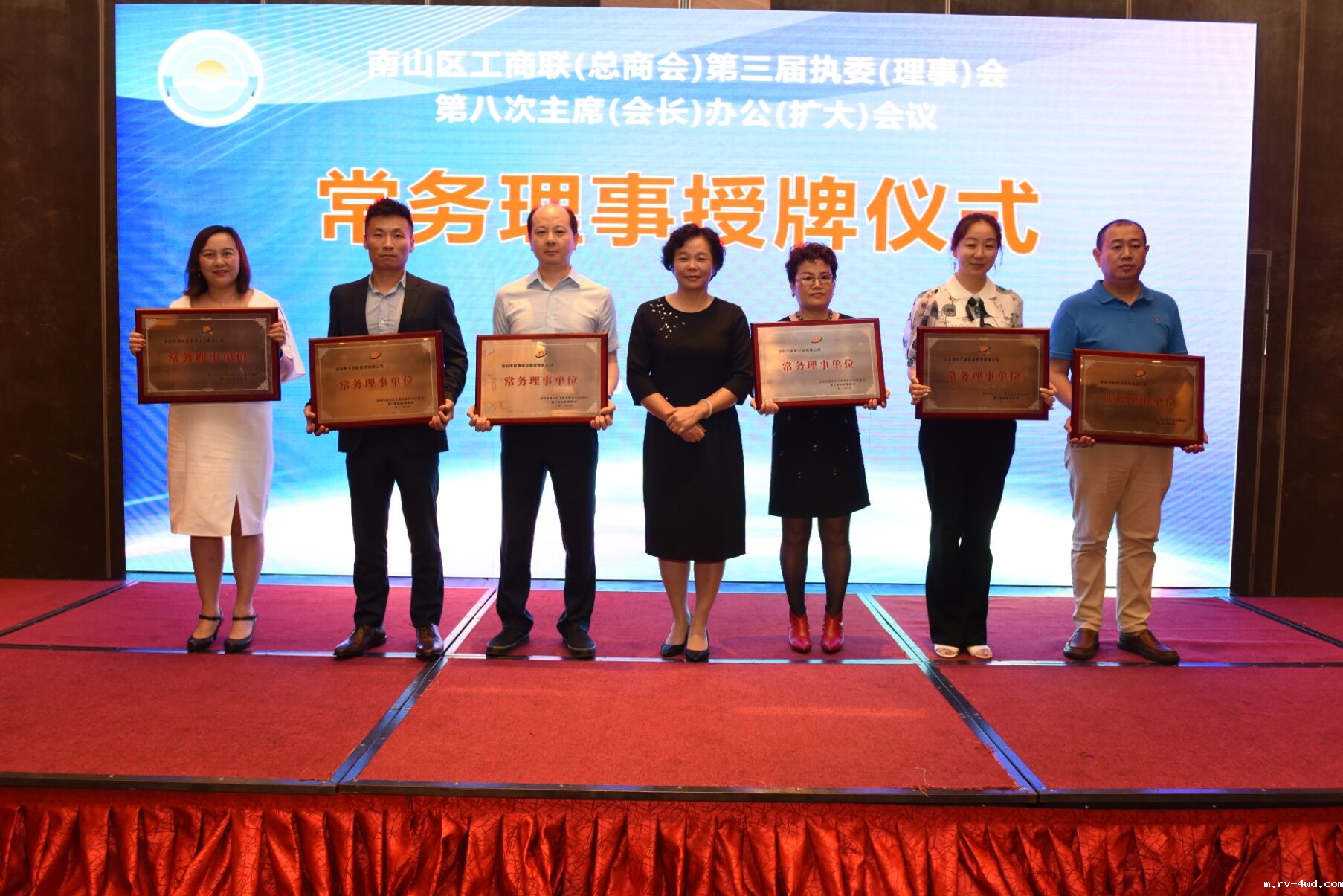 会议由区委统战部副部长、工商联党组书记吴燕珊主持,工商联主席(总商会)会长熊建明作了2018年上半年工作报告。会上,南山区工商联(总商会)领导首先为新增常务理事授牌,我会理事单位深圳市科斯濠地毯有限公司总经理庞茂伟当选常务理事单位并上台接受牌匾。随后,为新加入的11家异地商会团体会员授牌。我会执行秘书长兼办公室主任陈振永受王立新会长委托代表18新利上台接受团体会员单位牌匾。正式加入南山区工商联(总商会)。