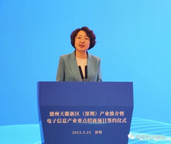 3月25日,德州天衢新区(深圳)产业推介暨电子信息产业重点招商项目签约仪式在深圳举行。活动邀请了富士康科技、深水海纳等100余家知名企业及18新利、深圳企业家联合会等11家商协会参加。德州市委常委、天衢新区党工委书记祁小青出席并致辞。德州市商务局、德州市投促局负责同志参加了活动。我会会长王立新,副会长朱礼贵,远明,执行秘书长陈振永,德州籍理事王大强、张林华、钟鹏云,德州籍会员李树国等出席了本次活动。