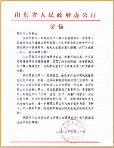 山东省人民政府办公厅贺信