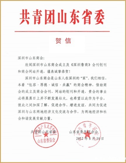 共青团山东省委贺信