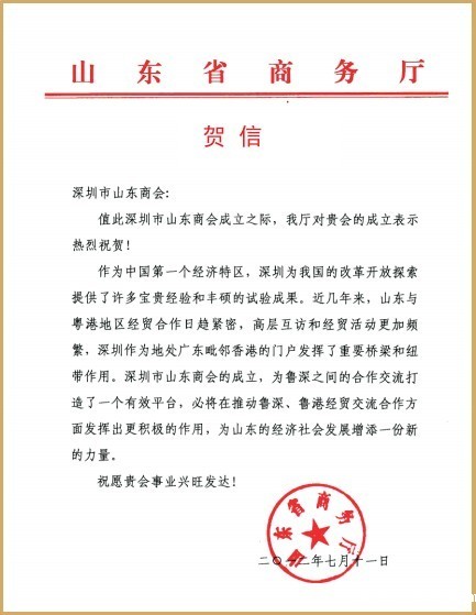 山东省商务厅贺信