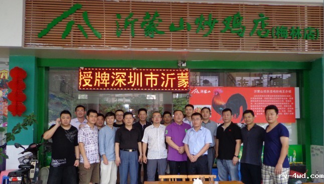 副会长郭林槐、梁庆伟、秘书长助理卢立建和会馆馆长、深圳市沂蒙山餐饮有限公司总经理马磊与参加揭牌仪式的会员合影
