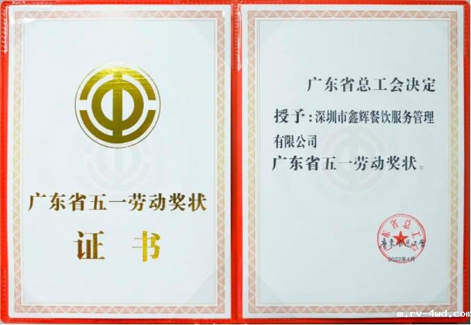 ▲鑫辉餐饮集团荣获2022年广东省五一劳动奖状证书