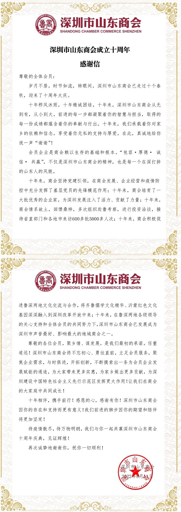 18新利成立十周年感谢信