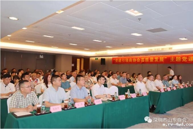 党课由商会党委副书记、会长王立新同志主持,党委副书记、执行会长张焕祥同志,党委委员、济南商会党总支书记张永军同志,商会各党支部书记,党务工作者及党员代表,山东16地市驻深办代表、滨州市赴深圳“体悟实训”队代表等90余人参加了主题党课学习。