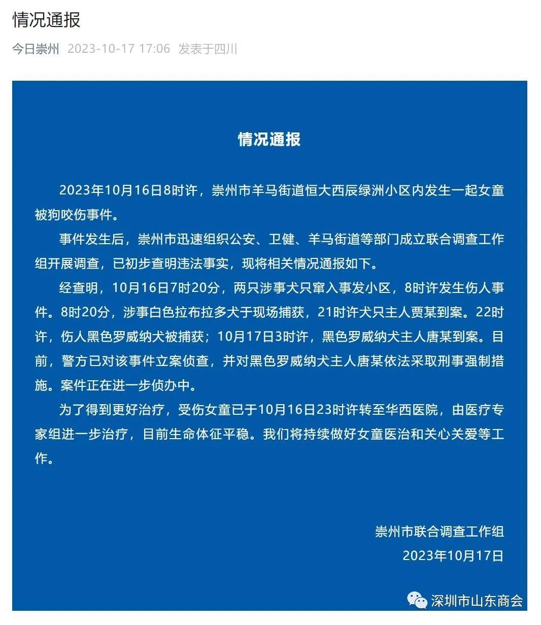 联合工作组通报狗咬伤女童情况:受伤女童已转至华西医院