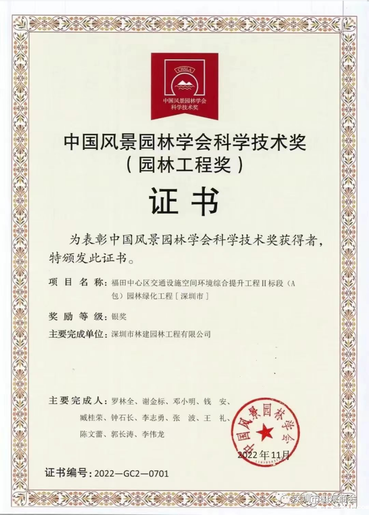 今年初,中国风景园林学会科学技术奖(园林工程奖) 评选结果正式揭晓,深圳市林建园林工程有限公司“福田中心区交通设施空间环境综合提升工程Ⅱ标段(A包)园林绿化工程”荣获国家园林工程银奖。