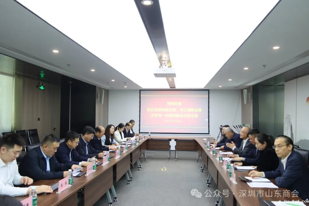 2024年12月26日,安丘市政协副主席、市工商联主席王洪书,安丘市委统战部分管日常工作的副部长苏瑛,安丘市委组织部副部长、市党员教育中心主任董晓娜,安丘市委统战部副部长、市侨办主任、市港澳办主任牛茂华,安丘市投促中心副主任李明,安丘市政府驻深圳办事处主任马翀,安丘市农投集团副总经理于国庆等一行15人到访我会对接交流,我会会长王立新,副会长王刚,党委办公室主任张含增,理事高树谦,执行秘书长兼办公室主任陈振永,副秘书长、潍坊商会秘书长扈炳燕等热情接待并座谈交流。