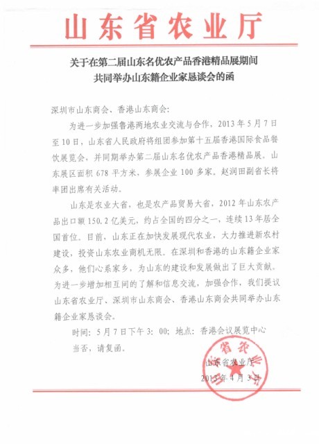 为进一步加深鲁、港、深三地农副产品及相关企业的交流与合作,为会员企业拓展业务服务,5月7日下午2:30时,在香港同时举办我会部分会员企业与山东参展名优企业合作交流恳谈会。请有意出席会展和恳谈会的会员,于4月18日前将名单报商会办公室。(限20人,额满为止)