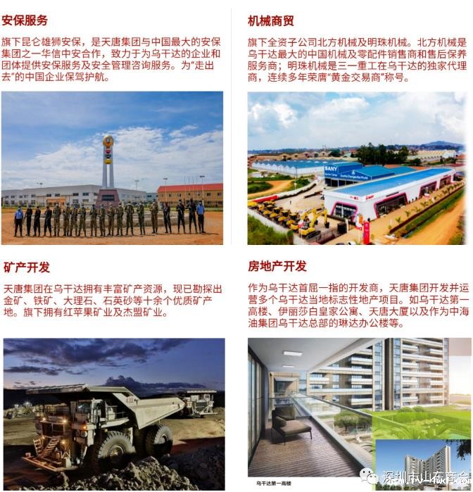 天唐集团是一家位于非洲明珠——乌干达的多元化综合性的大型民营企业集团,业务涉及园区投建、生产制造、酒店餐饮、旅游服务、房地产开发、矿产开发、机械商贸、安保服务等八大领域,目前在乌拥有20余家全资子公司,员工3,000余人。自成立之初,集团便坚持走本土化的发展策略, 经过二十年的艰苦奋斗,现已在整个东非区域内享誉盛名。