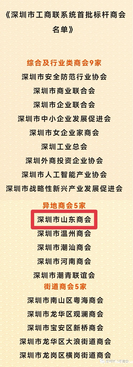 为深入贯彻习近平总书记对新时代民营经济统战工作作出的重要批示指示精神,全面贯彻落实《中国共产党统一战线工作条例》和《关于加强新时代民营经济统战工作的意见》精神,持续深化工商联商会改革,按照《关于开展深圳市工商联系统首批标杆商会创建工作的通知》要求,经过材料申报、创建培训、走访指导、指标体系测评、实地评审、市工商联领导班子会议审议等程序,于11月28日-12月5日予以公示。